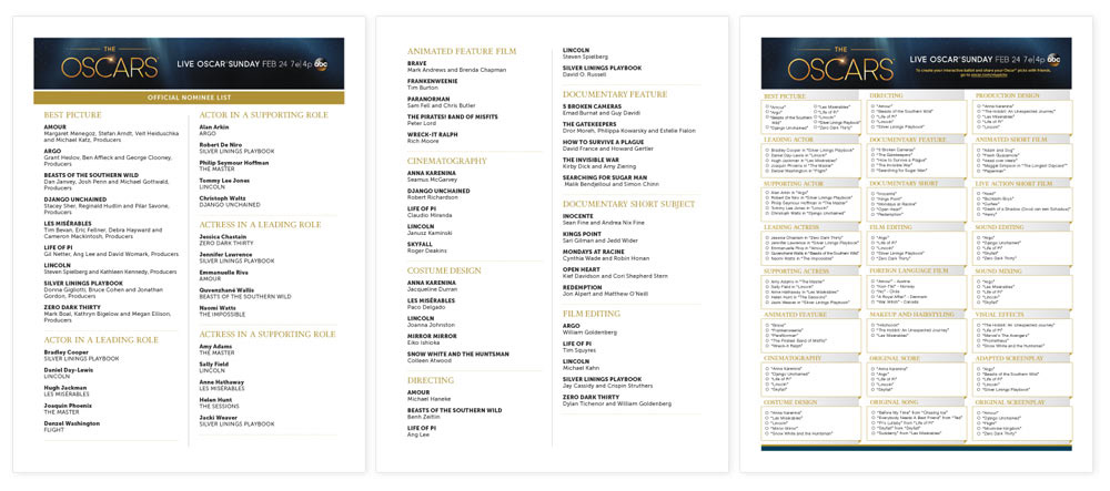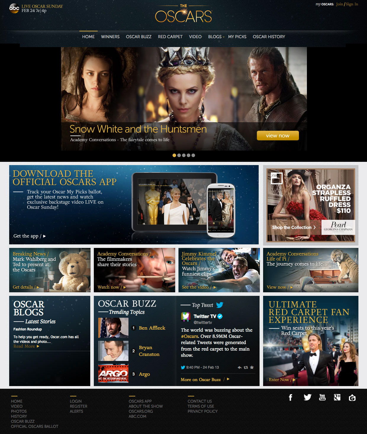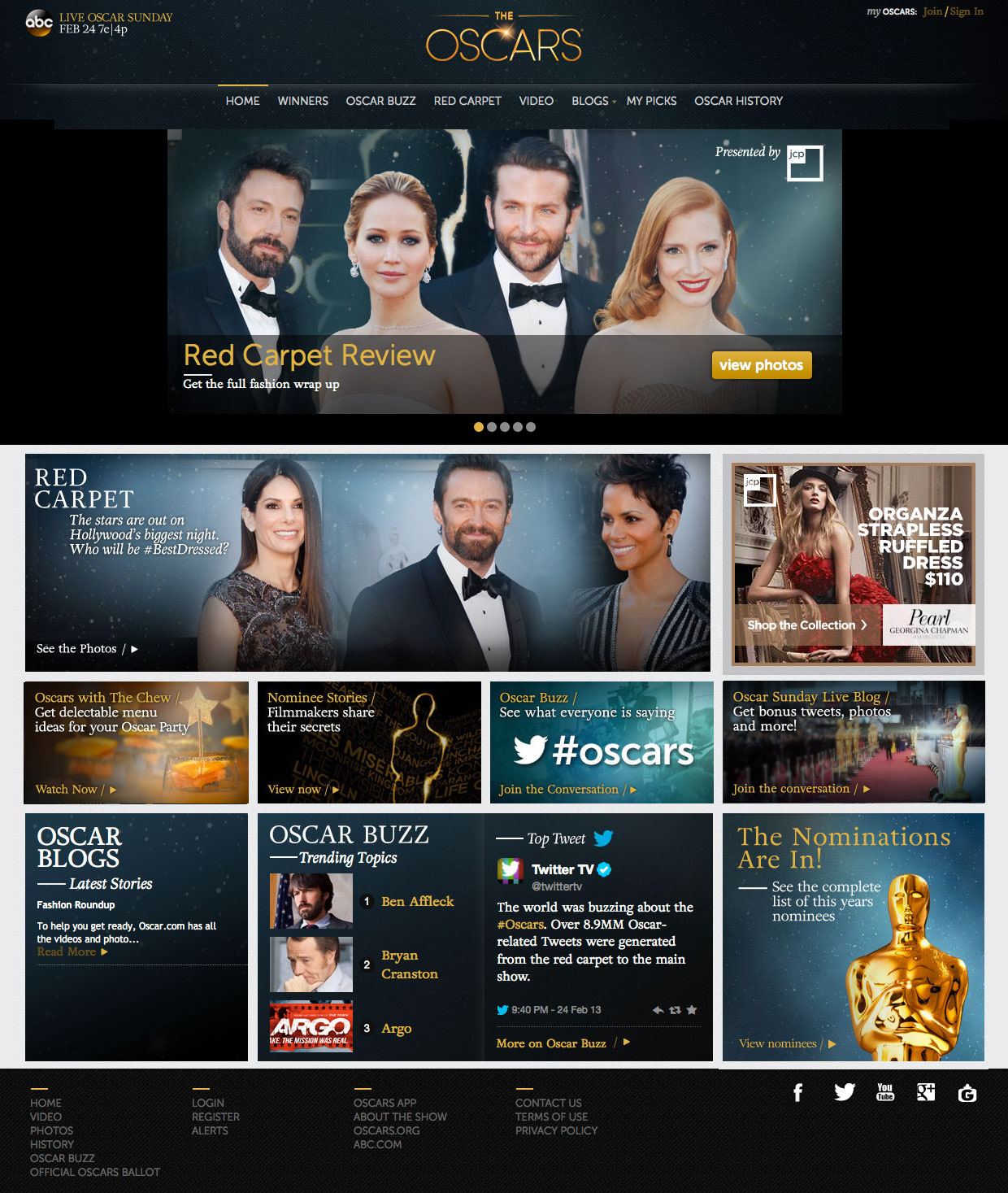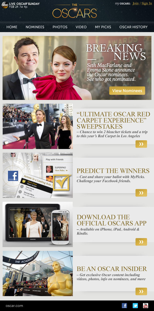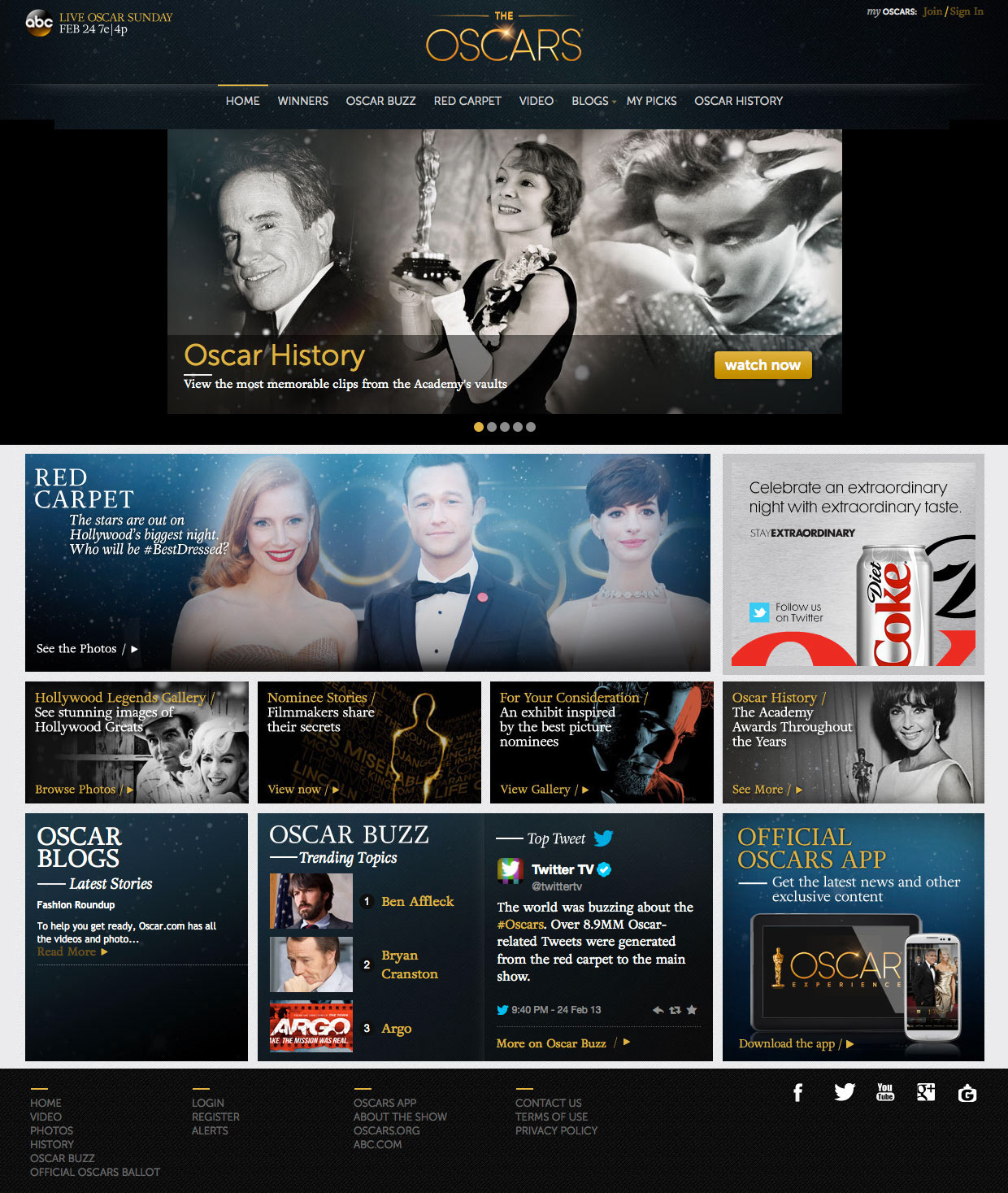 Creation of hero images, secondary features, web tiles to populate existing Oscar.com template. Email newsletter design, banners, Nominee List and Printable Ballot design.